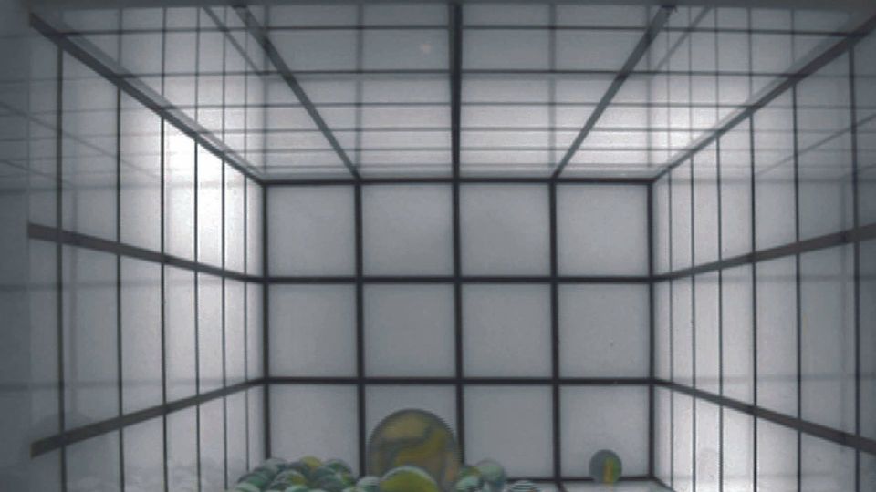 We zien één grote en heel veel kleine knikkers in een witte, helder verlichte ruimte. De knikkers bewegen zich van links naar rechts, van voor naar achter. Dan beginnen ze plotseling te springen, naar de muur rechts, naar het plafond en weer naar beneden. Zijn dit gewone knikkers, of toch iets anders? Waarom trekken ze zich niks aan van de wetten van de zwaartekracht? Kijken we van onderaf, of juist naar beneden?