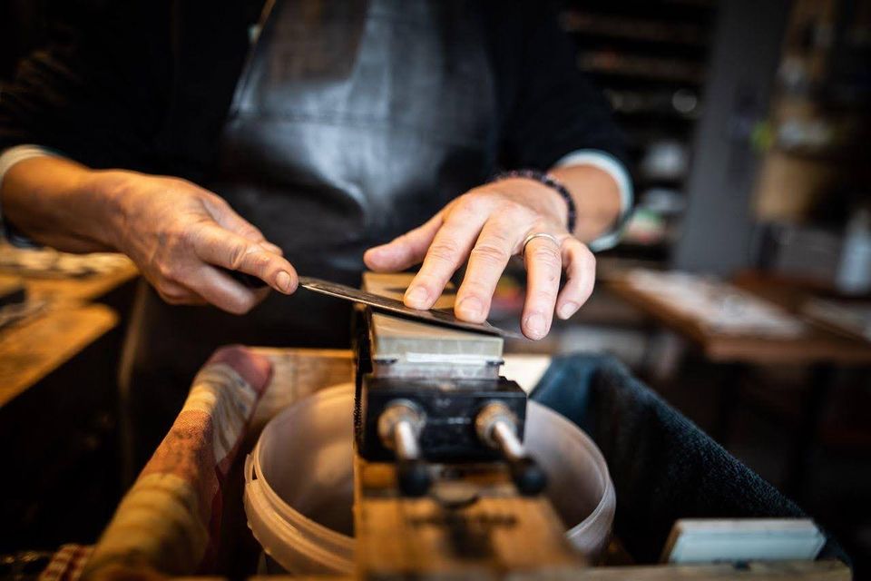 Ik heb geen officiële opleiding gevolgd. Ik heb mezelf het vak aangeleerd door intensief te oefenen, onderzoek te doen en te studeren. Ik leerde via online bronnen, onder andere technieken uit livestreams van Aziatische meester-slijpers. Het was een proces van proberen en falen, herhalen en gevoel ontwikkelen voor het ambacht. Ik werk uitsluitend met traditionele Japanse wetstenen, zonder machines, volledig met de hand. Ik heb veel respect voor de Japanse toewijding en precisie, en dat eer ik in mijn werk. Ik vind het prachtig om kapotte messen te herstellen en ze weer tot leven te brengen.'