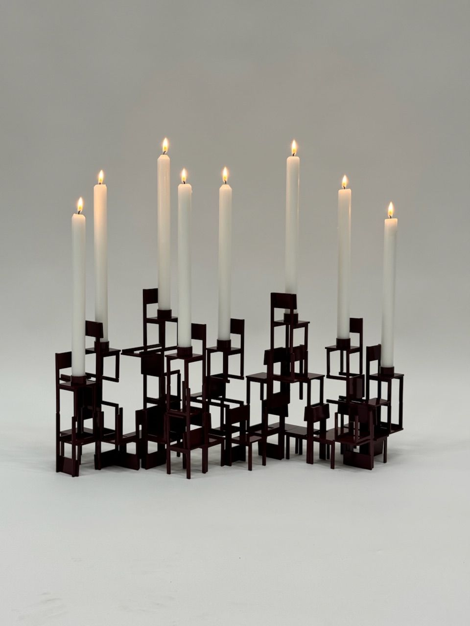 Branden de kaarsen, dan werpt het licht gelaagde schaduwen die de lijnen en het ritme van de stoelen versterken en zo een extra dimensie toevoegen aan het werk. Zo komt de visie van de ontwerper letterlijk tot leven in het spel van licht en donker.