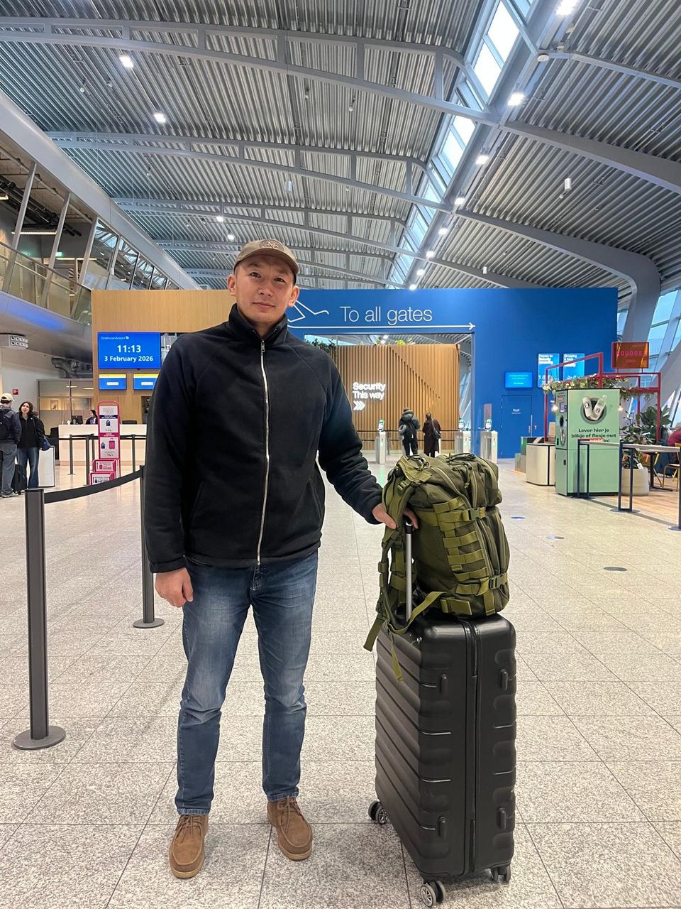 Nu begint hij aan de terugreis naar huis. Vanaf Eindhoven Airport vlieg ik eerst naar Istanbul en daarna neem ik een aansluitende vlucht naar Kirgizië.'