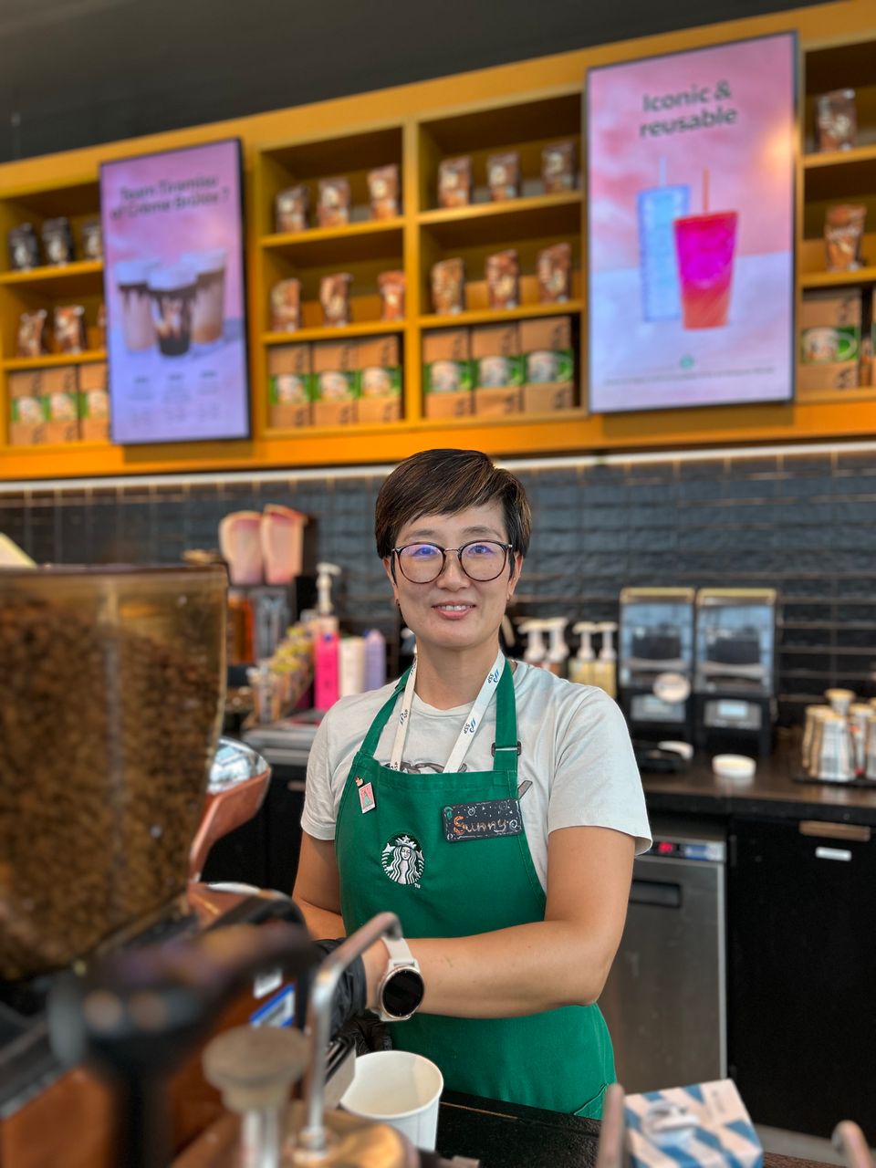 'Ik werk bij Starbucks hier op Eindhoven Airport. Zestien jaar geleden verhuisde ik naar Eindhoven, vanwege het werk van mijn man bij ASML. In 1999 begon hij daar, en volgende week vieren ze zijn jubileum. Toen we hier net kwamen wonen, voelde de stad klein en gezellig. Nu is Eindhoven veel dynamischer en internationaal. Engels spreken is hier nooit een probleem. Ik gaf een tijd Koreaanse les aan kinderen. De Koreaanse community organiseert events zoals sportdagen of de jaarafsluiting, maar omdat ik vaak druk ben met mijn kinderen, kan ik er niet altijd bij zijn. Mijn zoon (15) en dochter (17) zitten op 6 vwo en 4 vwo. Ze hockeyen, zwemmen en mijn zoon en ik spelen samen golf. Zelf sport ik graag bij David Lloyd in Meerhoven: zwemmen, body pump of gewoon samen sporten met mensen die ik er heb leren kennen. Eindhoven is voor mij echt thuis geworden. Ik ga graag naar de film, buurtfeesten of een gezellig etentje. Reizen doen we meestal in de schoolvakanties. Afgelopen zomer Kreta, voor de volgende trip hebben we nog niets gepland. Maar dat komt vast.'